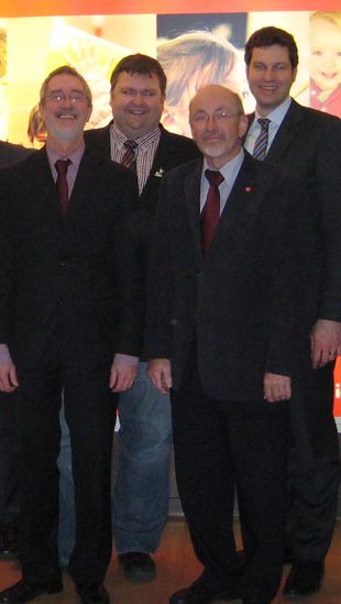 Bild (v.li.n. r.):Dr. Günther Horzetzky (Staatssekr. WiMi.), Jörg Czwickla (AGS), André Brümmer (AGS), Thomas Eiskirch (Wirtschaftspol. Sprecher der SPD-Fraktion in NRW).