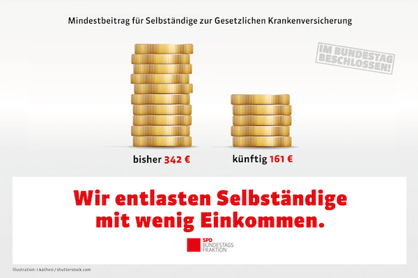 Im Bundestag beschlossen: Selbständige zahlen künftig einen deutlich geringeren Mindestbeitrag in der Gesetzlichen Krankenversicherung. Das entlastet viele Selbständige mit geringem Einkommen. Und es macht die Gesetzliche Krankenversicherung für Selbständige attraktiver.